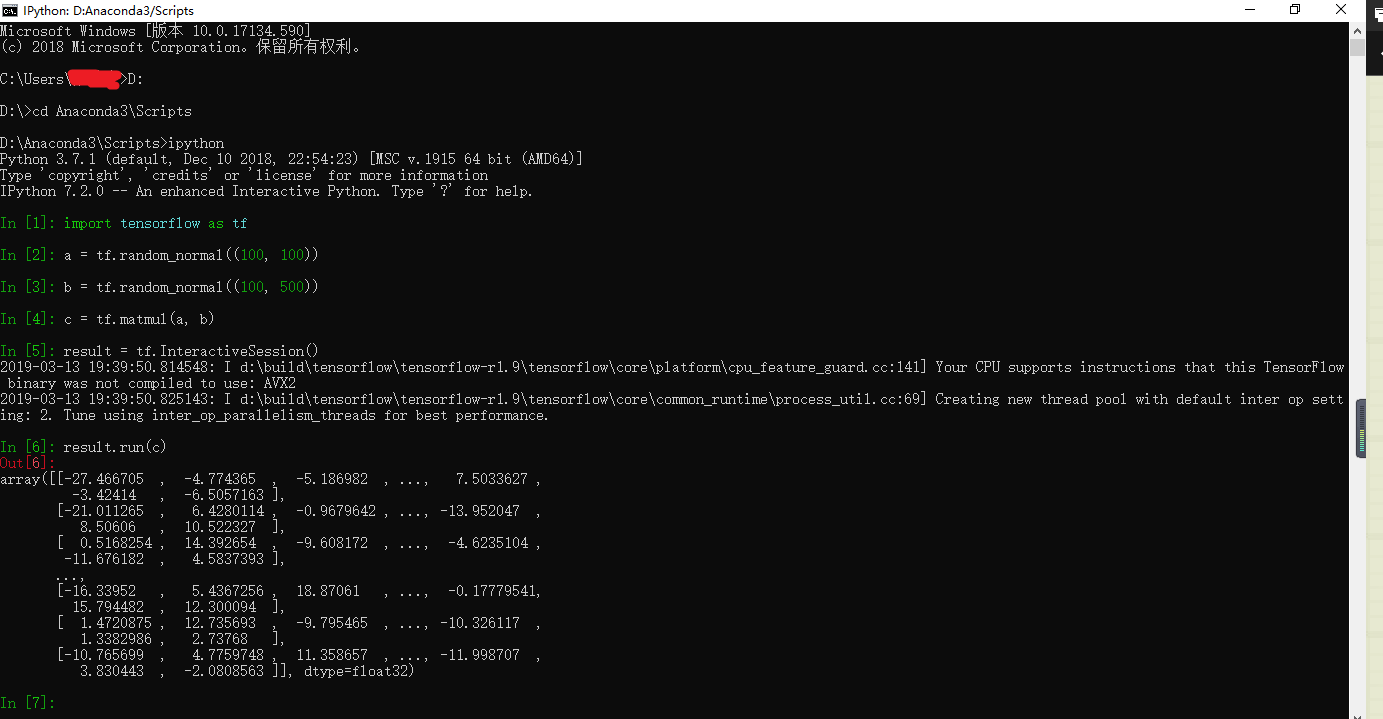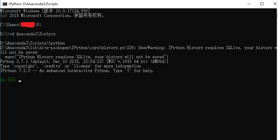 依旧是打开cmd,输入D: 回车 cd Anaconda3\Scripts 回车(具体指令根据你的安装目录修改)转到Scripts目录下,然后输入:ipython 回车(跟前面操作一样)