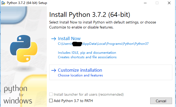 记得勾选下面那个选项:✔ADD Python 3.7 to PATH
