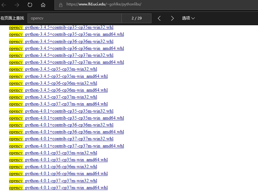 进入镜像站之后:按Ctrl+F键进入页面查找,输入opencv,找到如下区域: