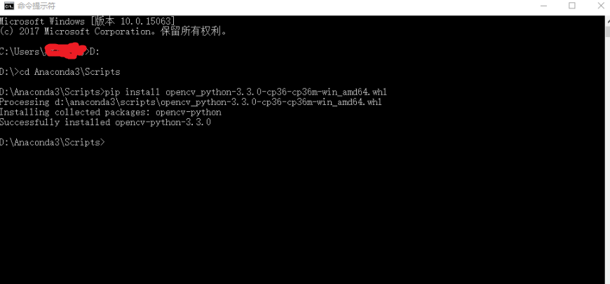 然后输入pip install opencv_python-4.0.1-cp37-cp37m-win_amd64.whl 回车