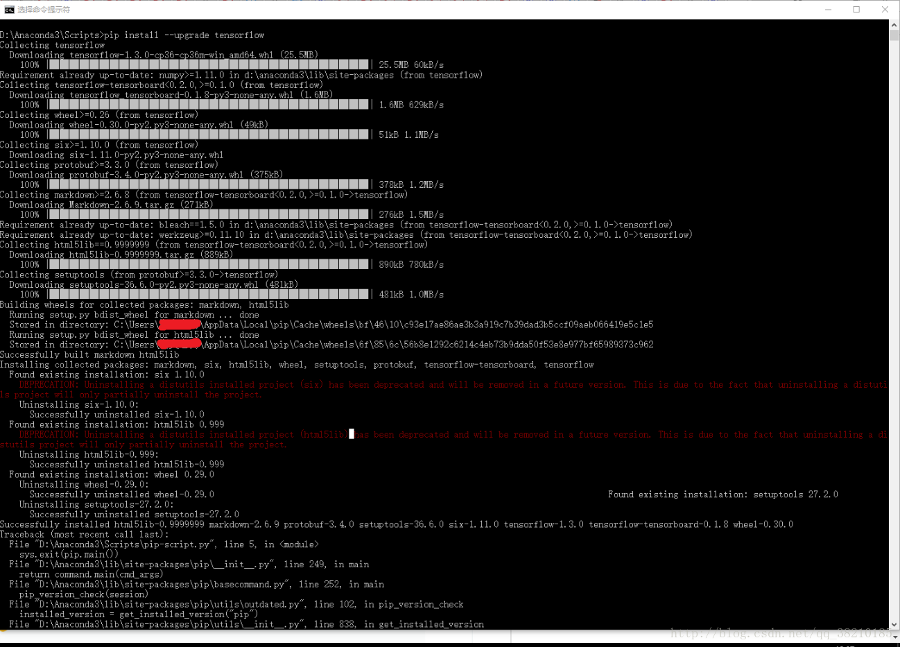 然后继续安装tensorflow,同样是在Scripts目录下,输入pip install tensorflow回车
